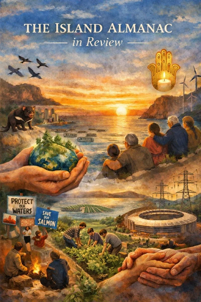 This year, The Island Almanac started feeling more like a living instrument I kept returning to in order to sense what was really happening beneath the headlines, beneath the daily churn of announcements and outrage, beneath the hardening of positions that so often passes for public life in Tasmania, Australia, globally and beneath the fatigue that settles in when people can feel that something is wrong but cannot quite locate where to place their hands, their hearts, or their hopes.